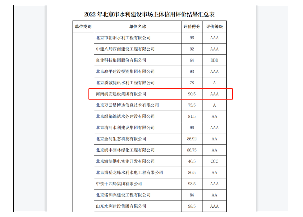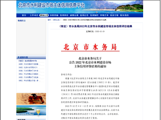 2022年12月22日,北京市水務(wù)局發(fā)布關(guān)于公告2022年北京市水利建設(shè)市場主體信用評價結(jié)果的通知,集團公司以90.5的高分通過了此次評價,獲得了高等級AAA級信用評價,為集團公司開拓水利業(yè)務(wù)打下了良好的基礎(chǔ)。